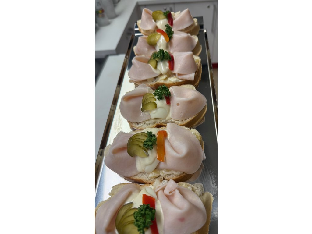 zemiakový šalát, šunka, vajíčko, kyslá uhorka, červená paprika, zálievka